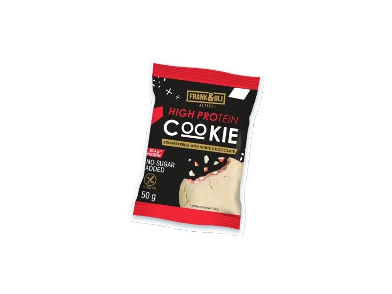 Το μπισκότο Frank & Oli High Protein Cookie Strawberries with White Chocolate υψηλής περιεκτικότητας σε πρωτεΐνη με φιστίκια και λευκή σοκολάτα συνδυάζει τη λεπτή γλυκύτητα της λευκής σοκολάτας, το πλούσιο άρωμα των φιστικιών και μια ελαφριά νότα καρύδας, δημιουργώντας ένα πρωτεϊνικό σνακ που δεν είναι μόνο νόστιμο, αλλά υποστηρίζει και έναν υγιεινό τρόπο ζωής.
