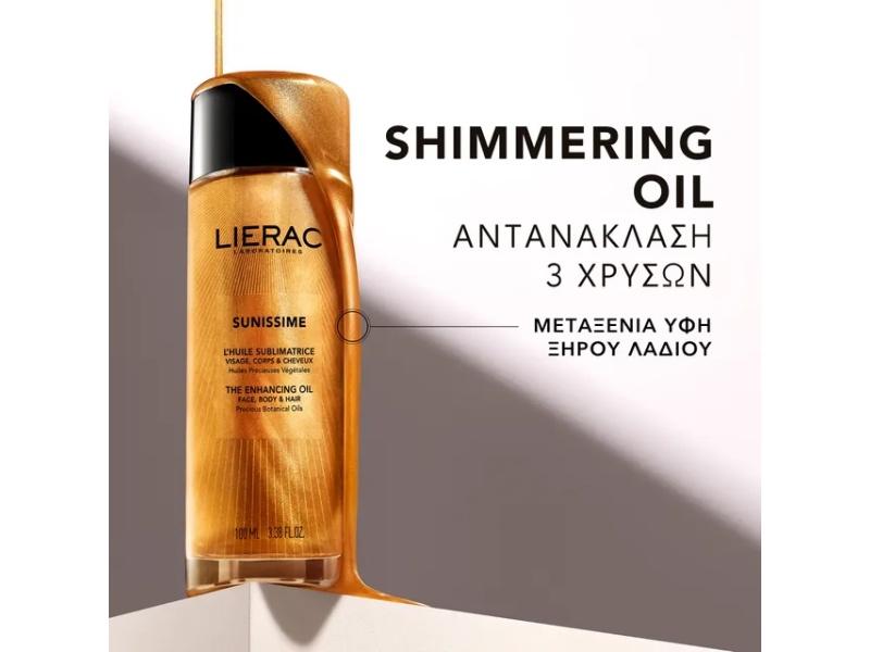 Το Λάδι Εξύψωσης της Lierac Sunissime είναι ένα ακαταμάχητο λαμπερό λάδι που αποκαλύπτει άμεσα τη λάμψη του δέρματος και των μαλλιών.