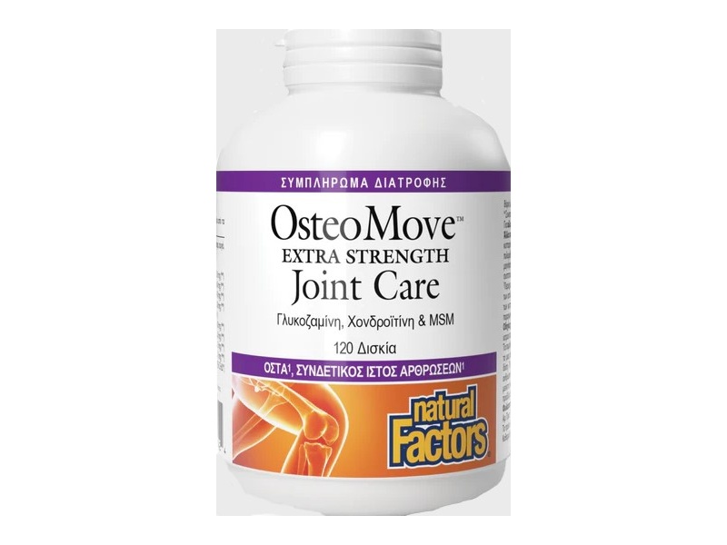 Το Natural Factors OsteoMove Extra Strength Joint Care είναι μία ενισχυμένη φόρμουλα με γλυκοζαμίνη, χονδροϊτίνη, MSM, μαγγάνιο, βόριο, κολλαγόνο, υαλουρονικό οξύ και άλλα ευεργετικά συστατικά όπως βοσβέλια, κουρκουμά και μίγμα φρούτων με πολυφαινόλες.