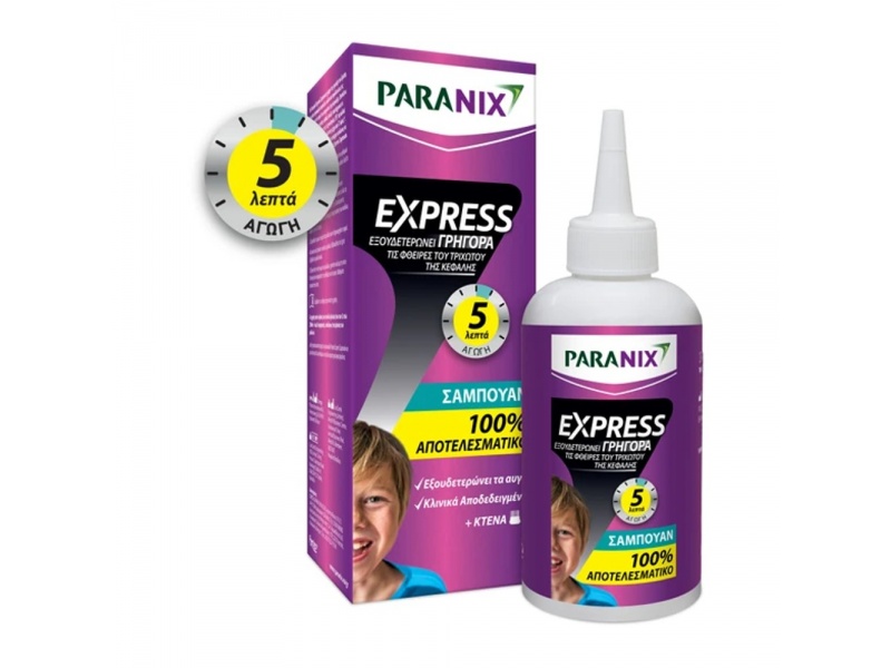 Το Paranix Express Σαμπουάν έχει αποδειχθεί 100% αποτελεσματικό έναντι των φθειρών του τριχωτού της κεφαλής σε 5 λεπτά και προστατεύει από πιθανές επαναμολύνσεις.