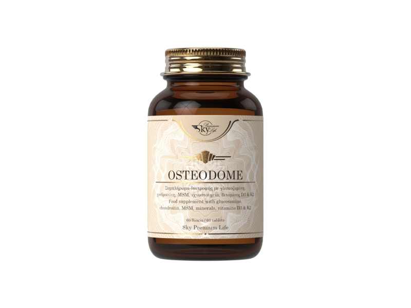 Osteodome της Sky Premium Life είναι ένα καλά μελετημένο συμπλήρωμα διατροφής, ειδικά σχεδιασμένο για να υποστηρίζει τη φυσιολογική λειτουργία οστών και χόνδρων, καθώς και την ευλυγισία των αρθρώσεων. Περιέχει γλυκοζαμίνη, χονδροϊτίνη, MSM, Υαλουρονικό Οξύ, εκχυλίσματα κουρκουμά, πράσινου τσαγιού και ελαιόδεντρου, βιταμίνες C, D3, K2 και μέταλλα όπως ψευδάργυρο και μαγγάνιο, που συμβάλλουν: