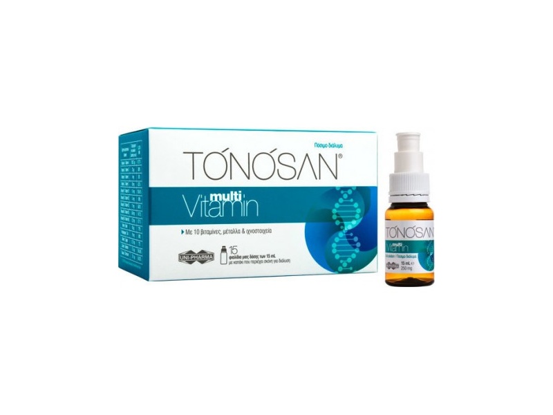 Uni-Pharma TONOSAN multi Vitamin Συμπλήρωμα Διατροφής με 10 βιταμίνες , μέταλλα & ιχνοστοιχεία 15 φιαλίδια μιας δόσης των 15 ml