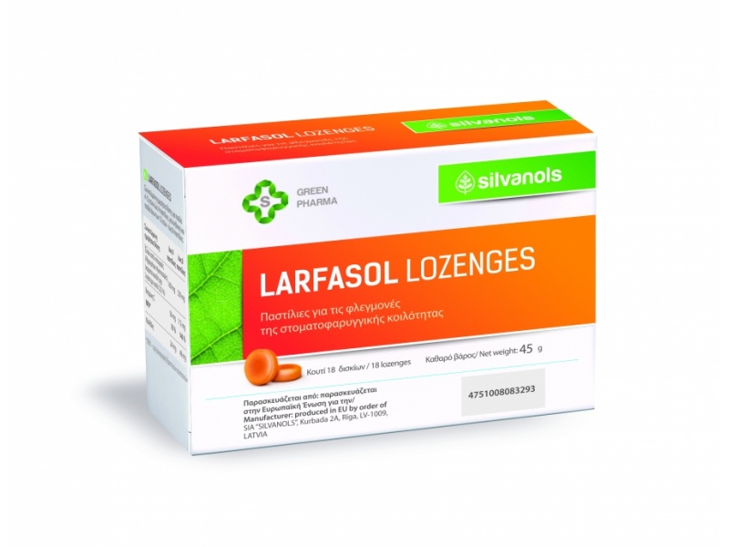 Οι Larfasol lozenges είναι οι μοναδικές παστίλιες με έλαιο ιπποφαούς, βιταμίνη C και μινθόλη, που βοηθούν στην επούλωση και τον κατευνασμό των φλεγμονών της στοματοφαρυγγικής κοιλότητας. Είναι μοναδικές γιατί το έλαιο από ιπποφαές που περιέχουν είναι ιδανικό στην επούλωση των φλεγμονών και στην ανάπλαση των πασχόντων ιστών. Έτσι, οι Larfasol lozenges με την τριπλή φόρμουλα, παρέχουν άμεση ανακούφιση στον ερεθισμένο λαιμό επουλώνοντας τον φλεγμαίνοντα βλεννογόνο, αναπλάθουν τους ιστούς και μειώνουν το αίσθημα του πόνου.